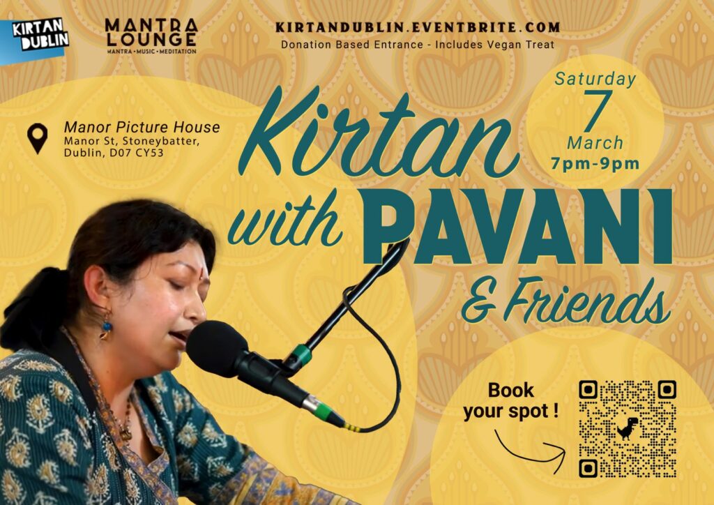 We’re delighted to welcome you to this month’s kirtan gathering, led by Pavani from Wicklow and few of her friends will be joining us too.